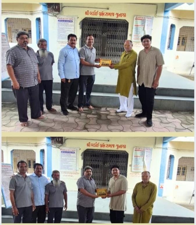 કચ્છ – સૌરાષ્ટ્રના સમસ્ત બ્રહ્મ સમાજના દેવભૂમિ દ્વારકા જિલ્લાના ટ્રસ્ટી તથા પ્રમુખ તેમજ ખંભાળિયાની જાણીતી સેવા સંસ્થા શ્રી રાજ્યગુરુ ચેરીટેબલ ટ્રસ્ટના ટ્રસ્ટી તથા ખંભાળિયા બરડાઈ બ્રાહ્મણ સમાજના વિજયભાઈ રાજ્યગુરુ દ્વારા જુનાગઢ ખાતે બરડાઈ બ્રહ્મ સમાજના તમામ બરડાઈ બ્રાહ્મણ સમાજના ઘર સુધી પ્રસાદી સ્વરૂપે સોમનાથ મહાદેવની ગોલ્ડન ફ્રેમ સહીતની છબી અર્પણ કરવામાં આવી હતી.શ્રી બરડાઈ બ્રહ્મ સમાજ જૂનાગઢ વતી કિશોરભાઈ હરજીભાઈ જોશી, કિરીટભાઈ નારણજીભાઈ થાનકી, સમિકભાઈ નારણજીભાઈ જોષી, ધનજીભાઈ ભીમજીભાઈ જોષી વિગેરે ઉપસ્થિત રહ્યા હતા.