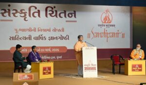 પોરબંદર સ્થિત સાંદીપનિ વિદ્યાનિકેતનના પવિત્ર પરિસરમાં પૂજ્ય ભાઈશ્રી રમેશભાઈ ઓઝાની પ્રેરક ઉપસ્થિતિમાં ‘સંસ્કૃતિ ચિંતન સાહિત્યની વાર્ષિક જ્ઞાનગોષ્ઠી’નું ભવ્ય આયોજન કરવામાં આવ્યું હતું. બે દિવસીય આ જ્ઞાનસત્રમાં સાહિત્ય, કલા અને ભારતીય સંસ્કૃતિના વિવિધ પાસાઓ પર દેશભરના નામાંકિત વિદ્વાનો અને ચિંતકોએ ગહન મંથન કર્યું હતું. કુલ સાત વિવિધ સત્રોમાં વિભાજિત આ કાર્યક્રમમાં ગુજરાતી સાહિત્યના વારસાને સાંપ્રત સમયની જરૂરિયાતો સાથે જોડીને વૈચારિક ભાથું પીરસવામાં આવ્યું હતું.