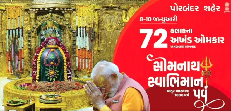 સમગ્ર ભારતના ગૌરવ અને સ્વાભિમાન સમાન પ્રથમ જ્યોતિર્લિંગ સોમનાથ મહાદેવના સાનિધ્યમાં વડાપ્રધાન શ્રી નરેન્દ્રભાઈ મોદીના અધ્યક્ષ સ્થાને ‘સોમનાથ સ્વાભિમાન પર્વ’ની ભવ્ય ઉજવણી કરવામાં આવી રહી છે. આ પર્વના ઉપલક્ષમાં પોરબંદર શહેરના ઐતિહાસિક ભાવેશ્વર મંદિર ખાતે શિવભક્તિનો અનોખો માહોલ જોવા મળી રહ્યો છે. અહીં ગતરોજથી ૭૨ કલાકના અખંડ ઓમકાર જાપ અને મંત્રોચ્ચારનો ભક્તિભાવપૂર્વક પ્રારંભ કરવામાં આવ્યો છે.
